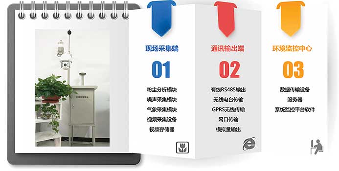 可对粉尘、噪声、风速风向、温湿度、大气压、降水量等多种环境参数进行监控,配合视频显示及远程传输功能。