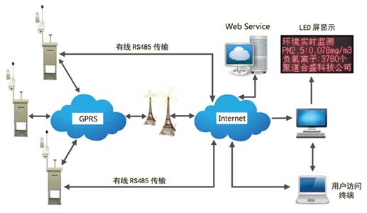 本系统以互联网为纽带,与云技术相结合,组建现场端到监控平台的一个城域网,实现各监控点与监控平台的连接。现场端设备按照国家相关技术协议将实时粉尘监测浓度、噪声指标、气象六参数(风速风向、温湿度、大气压、降水量)数据及环境图像信号传输到监控平台,监控平台对监控数据和图像进行存储、统计、分析、处理,为重点区域环境管理提供数据支持和决策依据。(见原理图)