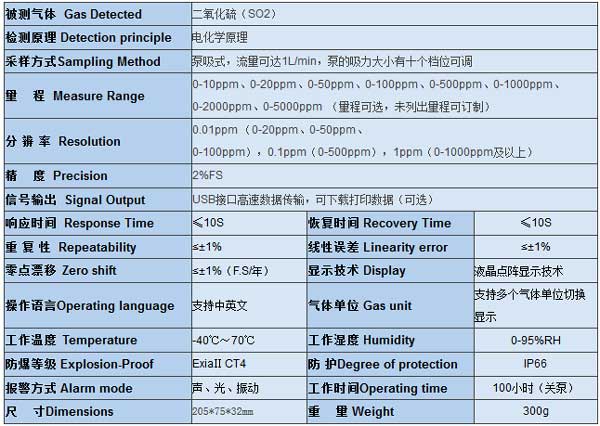 本仪器可监测环境中或密闭空间中二氧化硫浓度并报警。带自校验功能,零点标定功能,使气体监测更准确,更可靠。一键恢复出厂设置功能,可免去误操作的困扰。带温度和压力补偿,可完美实现不同温度和压强环境下对气体浓度的补偿。两级声光报警,报警点可自行设置。大容量锂聚合物充电电池。泵吸式采样方式,泵的吸力大小可调。外壳采用高强度特殊工程塑料,防滑,防水,防尘,防爆。精美高档的铝合金手提箱。