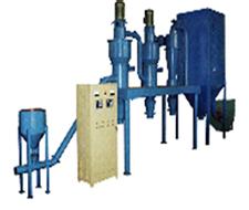 气流分级机的转子叶轮为复合双向离心式,叶轮高速旋转,在叶轮下部形成一负压区,分级筒内的空气经叶轮下部进风口进入,沿上叶轮流道从出口排出,经喷射细粒环流出,在控制环的作用下,气流旋转向上运动,在轴向和周向均存在分速度,气流经分级盘上部空间向内流动,经叶轮上部进口进入下叶轮,从下叶轮出口排出,排出的气流在筒内旋转向下运动,然后经内筒中部向上流向叶轮下部进风口,如此循环流动形成一交叉循环气流。从星型给料阀输入的物料落入高速旋转的甩料盘,在离心力的作用下甩向挡料环,在挡料环的作用下,物料向下撒落在分级筒内。粗颗粒物料在交叉气流的作用下,从控制环的壁片上滑落于粗料收集器中,而细粉则随转子上方中部吸风口的气流输送到下方微粉旋风收集器中(分级筒的内筒),这样,原料即被分为粗细两部分,而剩余的空气则由转子下方中部吸风口吸入,流经叶片、喷射细粒环、控制环,再从控制环周边向转子上方中部吸风口流回,形成周而复始的连续自动循环。跟随物料带入的多余空气以及由于分级室温度较高,空气膨胀而多余的气体则由余风口排出,以保证分级室内气流平衡、稳定。余风口套装一滤清布袋,使排出的空气不致污染环境。