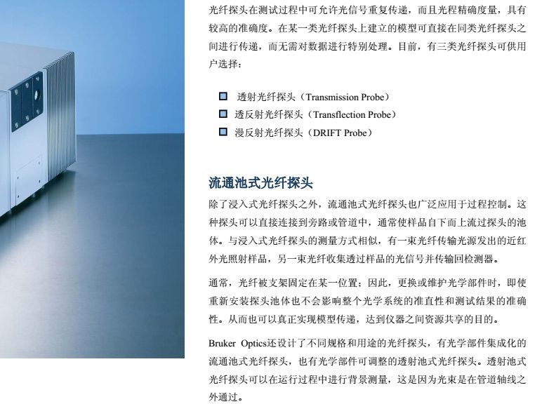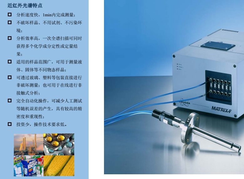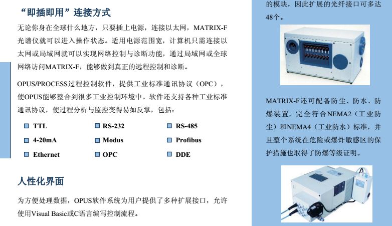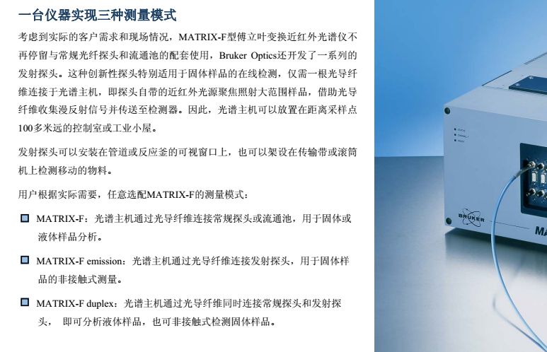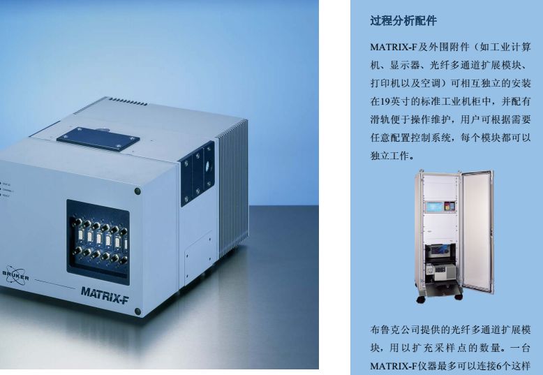 MATRIX-F型傅立叶变换近红外光谱仪是布鲁克公司推出的新一代工业在线过程分析仪, 也是第×台可直接应用于恶劣环境下的工业级近红外光谱仪,并在2000 年获得“R&D 100”金奖。仪器设计紧凑、坚固耐用,可同时连接多条光纤探头,直接用于反应釜或管道的过程监控。创新性的一体化设计保证了测试结果的连续性、准确性,大大减少了仪器故障的发生频率,真正意义上实现了仪器之间模型的传递与共享。同时,仪器还支持各种工业标准通讯协议,可与DCS等控制系统实现信息实时传输。因此,MATRIX-F能够最大程度的满足工业在线分析的各种要求,使过程控制达到更高境界。 从进厂原料的鉴定到中间产物、制成品的在线监测,MATRIX-F型傅立叶变换近红外光谱仪能够为过程控制提供完善的解决方案。采用内置多路器可使一台仪器同时监控6个反应过程。各种形式的光纤探头应用于过程分析,极大方便了对粉末、颗粒、粘稠液体等不同形态样品的检测。 MATRIX-F凭借独特的系统设计,既可用于实验室分析,进行方法开发;也可直接移至工业现场用于过程检测。此外,仪器外围附件还可以独立的安装在19英寸的标准工业机柜中, 并配有滑轨便于维护操作。 MATRIX-F操作方便、维护简单。所有易耗部件都是安置在预准直模块上的独立光学部件, 能够实现快速更换而无需重新调整仪器。此外,光学系统、检测系统和电子系统被安装在各自独立的密封室中,所以维修或更换某一系统时不会影响其他系统的密封与干燥。在线诊断系统实时监控各个部件的运行情况,帮助用户及时了解仪器的当前状态。仪器还配有内置标准验证单元,通过运行OVP软件确保测试系统处于正常运行状态。MATRIX-F 近红外在线光谱仪