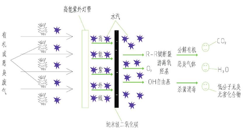 有机恶臭废气通过抽风机的提升进入UV光催化处理器,当废气经过光催化处理器时,采用电晕法对废气进行再处理, “光触媒”(也称为“光催化剂”)的主要成分是纳米级锐钛型二氧化钛(TiO2),在室温下,当波长在380nm以下的紫外光照射到纳米级二氧化钛颗粒上时,在价带的电子被紫外光所激发,跃迁到导带形成自由电子,而在价带形成一个带正电的空穴,这样就形成电子-空穴对。利用所产生的空穴的氧化及自由电子的还原能力,二氧化钛和表面接触的H2O,O2发生反应,产生氧化力极强的自由基,这些自由基可分解几乎所有有机物质,当空气旋流进入UV光催化反应腔时,高能“电子-空穴”对迅即与毒有害的有机物直接进行化学反应,氧化、分解为无污染的水分子有机物、水和二氧化碳等,使废气得到净化。