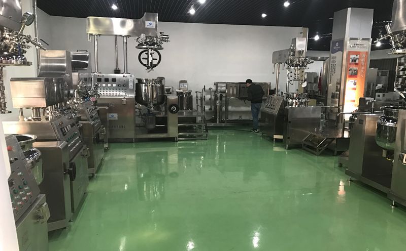 物料通过乳化锅内上部的中心搅拌、聚四氟乙烯刮板始终迎合搅拌锅形体,扫净挂壁粘料,使被刮取的物料不断产生新界面,再经过叶片与回转叶片的剪断、压缩、折叠,使其搅拌、混合而向下流往锅体下方的均质机处,物料再通过高速旋转的切割轮与固定的切割套之间所产生的强力的剪断、冲击、乱流等过程,物料在剪切缝中被切割,迅速破碎成200nm-2um的微粒,由于乳化罐内处于真空状态,物料在搅拌过程中产生的气泡被及时抽走。采用抽真空的方式,使所生产的制品在搅拌过程中不再混入气泡,从而保证可制造出富有光泽、细腻及延展性良好的优质产品。