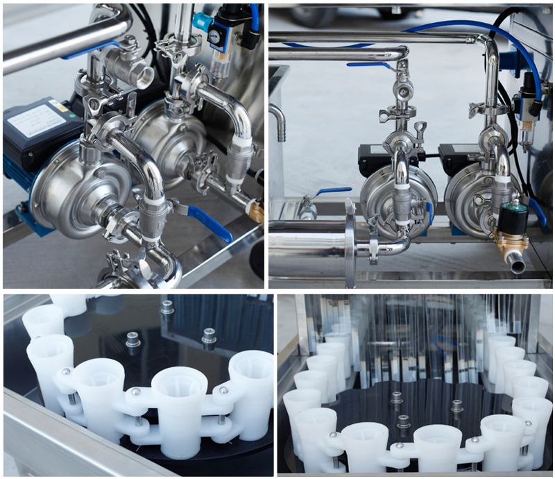 采用双位回转的方法,一人放瓶一人收瓶;机器共分上下工作位,上有高压水冲淋瓶子外部,内有高压水柱直冲瓶子内部;共两道高压水冲洗,第×道采用自来水,随后由高压气体冲,从而带走瓶内一部分水迹,接着进行纯水/酒精冲洗,随后高压气体带走一部分瓶内水迹。