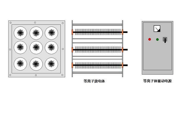 接着废气进入等离子模块,通过放电,电子从电场中获得能量,通过非弹性碰撞将能量转化为污染物分子的内能或动能,这些获得能量的分子被激发或发生电离形成活性基团,当污染物分子获得的能量大于其分子键能的结合能时,污染物分子的分子键断裂,直接分解成单质原子或由单一原子构成得无害气体分子。等离子体中包含大量的高能电子、正负离子、激发态粒子和具有强氧化性的后型自由基,这些活性粒子和部分废气分子碰撞结合,同时产生的大量OH、HO2、O等活性自由基和氧化性极强的O3,能与有害气体分子发生化学反应,最后生成无害产物。物理作用表现在具有荷电集尘作用。等离子体中的大量电子与颗粒污染物发生非弹性碰撞并粘附其表面从而使其荷电,在电场作用下,颗粒污染物被集尘极收集。生物作用表现在具有消毒杀菌之功效。机理为:等离子体中的正负粒子使微生物表面产生的电能剪切力大于其细胞膜表面张力,致使细胞膜遭到破坏而导致微生物死亡。