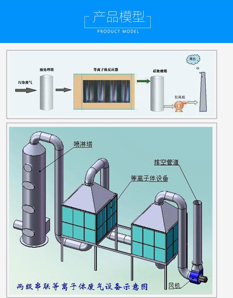 大流量低温等离子废气治理装置为真正意义上的等离子体废气治理技术。所要治理的废气通过等离子体区,使之离子化,形成电离状态,在高能电子和粒子的轰击下,加之等离子体态中丰富的氧化活性基团,在较短的时间类分解反应成为二氧化碳、水或是小分子化合物。而非单纯的依靠臭氧来氧化反应。这种等离子体治理废气的技术正是国内发改委、环保部等鼓励发展的先进技术,在国内处于应用推广阶段,其技术在国内处于先进水平。