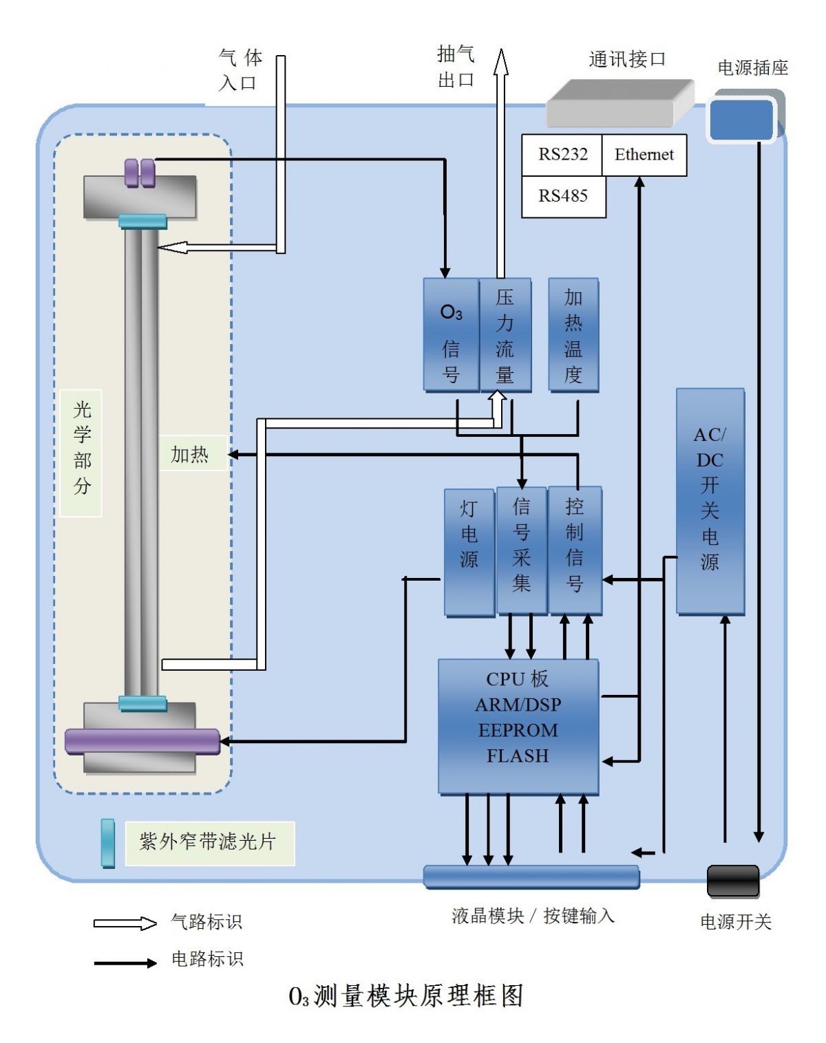 紫外光度法臭氧分析仪为单光路结构,待测气与参比气经转换电磁阀依次切换到同一测量池中,紫外光在吸收池中被待测气体中的臭氧吸收。吸收值的大小由光电器件转变为电信号,经前置放大器放大,A/D并由CPU计算出臭氧浓度。仪器的电路部分包括A/D、大屏幕液晶显示及D/A以及RS-485串行接口。显示器可以显示当前值、报警值、 温度和压力等以及自检和故障自诊断功能。