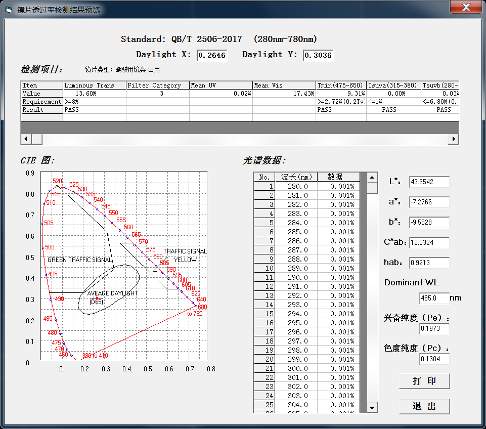 FLR-S01镜片透射比测试仪的测量原理是:通过光源发出的紫外、可见光谱经光栅分光、单色器滤光,再经过狭缝和准直光管及透镜组将扫描光谱分别透过测试样品后照射到光电传感器上,光信号转变成电信号,将模拟量变成数字量并进行数据采集,信号放大,经USB口送入微机进行处理,自动测量镜片可见光透射比、紫外光透射比;太阳镜类镜片的透射比;驾驶员用镜的透射比和对交通信号识别、黄色指数、蓝光透射比等全部性能指标。