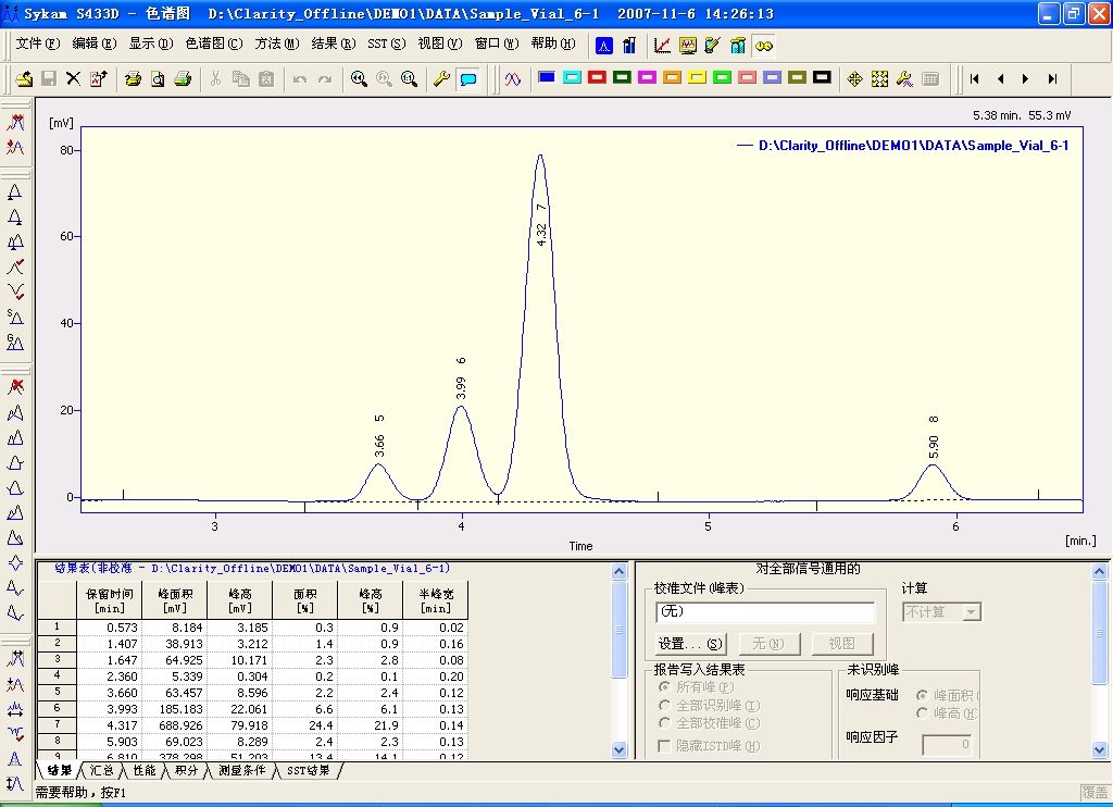 Clarity 是高性能的多通道、多用户的通用型色谱工作站。 该软件可以与任何气相色谱仪、液相色谱仪或带电压输出的电子设备连接,可同时采集一到四个独立检测器信号。多种形式的24 位高精度色谱信号采集,包括内置采集卡、外置采集器通过USB 或以太网传输数据。数字化的色谱仪和自动进样器控制方式:RS232C、GPIB 和网卡。硬件保修三年。Clarity 是基于Windows32 位系统开发的软件,友好的图形化用户界面,熟悉的视窗操作风格使色谱更易于操作。Clarity 全面支持GLP/FDA-21CFR Part11 电子署名认证、数据的有效性安全性、系统认证工具(IQ/OQ)及系统适用性测试(SST)。批处理功能使得仪器的控制、自动进样器序列采集、自动积分校正及输出报告均可一气呵成,将日常繁琐的分析简单化。强大的后处理功能,谱图比较、重校正、数据的输入输出、三维谱图处理等功能一应俱全。“Snapshot”可以在线得到分析结果而无需等到采集结束。