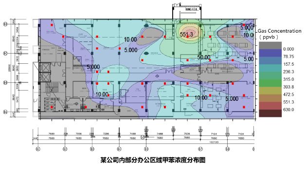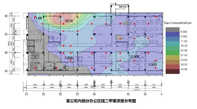 利用DT-100对某公司内部办公区域VOCs进行检测,可得到各物质区域空间浓度分布图。其中TVOC、甲苯、二甲苯的浓度分布图如下: