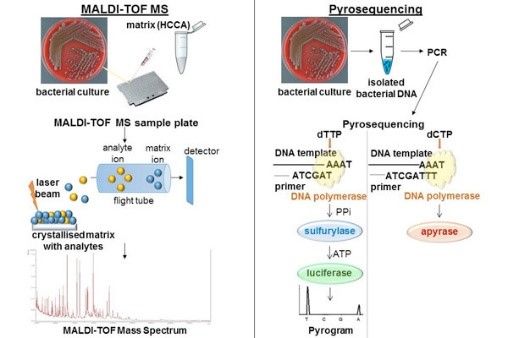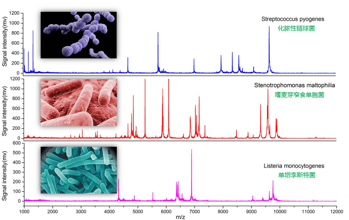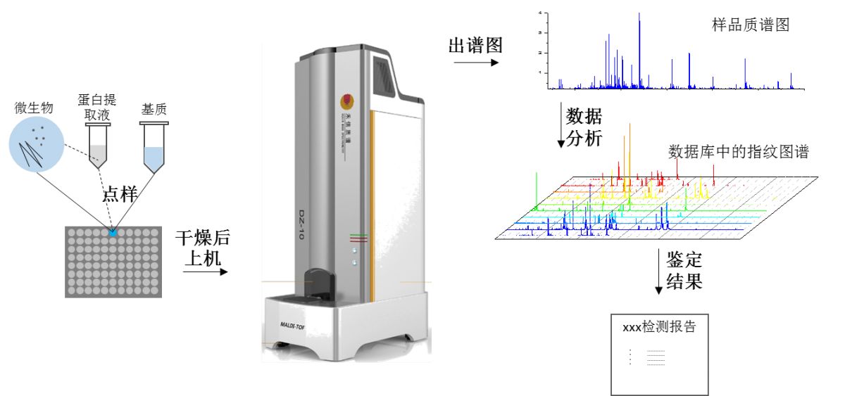 从培养皿中挑取痕量微生物菌落,或经蛋白提取液提取后均匀涂抹在样品靶上,自然风干后,加入基质进行检测。然后将检测到的谱图与数据库中的蛋白质指纹图谱进行对比分析,最终鉴定出微生物样品属种,整个过程仅需数分钟。