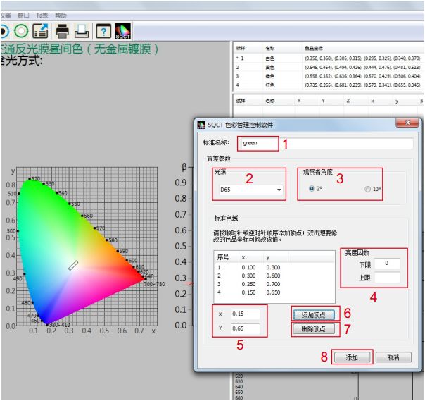 如图5所示,在位置1处输入标样名称,位置2处选择光源种类(默认为D65),位置3处选择观察者角度(默认为2度),位置4处输入亮度因数(除荧光物质外,普通反射样品亮度因数大于0小于1,即0<β<1)。在位置5处输入色品坐标点,然后点击“添加顶点”按钮,则新输入的色品坐标点出现在标准色域框内,重复上述步骤,依次输入各色品坐标点;对于输入错误的色品坐标点,先在标准色域框内选中,然后点击“删除顶点”按钮,则删掉该顶点。全部输入完毕,点击位置8处“添加”按钮,则完成“多边形-容差标样”建立。
