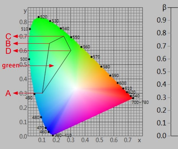 在《GB2893安全色》、《GB/T18833道路交通反光膜》等相关标准中,通常给出一块颜色区域(多个色品坐标点)和亮度因数要求,在D65/A光源和45/0几何条件下,判定样品是否落在对应的颜色区域内,借此判定样品是否满足标准规定的色度要求。由于颜色区域为多边形,如下图所示,导致使用普通的分光测色仪无法完成判定。NS808测色仪配合SQCT软件的交通路标测量模块则可以轻松解决这方面的问题。