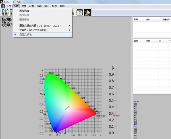 针对国内交通路标使用较多的标准GB/T18833,SQCT软件将该标准中的标准色域纳入其中,客户只需根据自己需要进行选择即可。