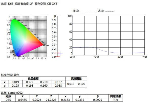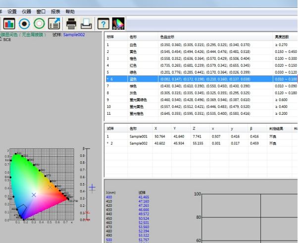 譬如如何判定蓝色试样是否在《GB/T18833-2012道路交通反光膜样》所规定的蓝色区域内(无金属镀层,昼间反光膜颜色),按照下面的步骤,将依次完成测量和判定。