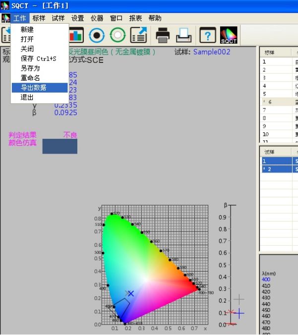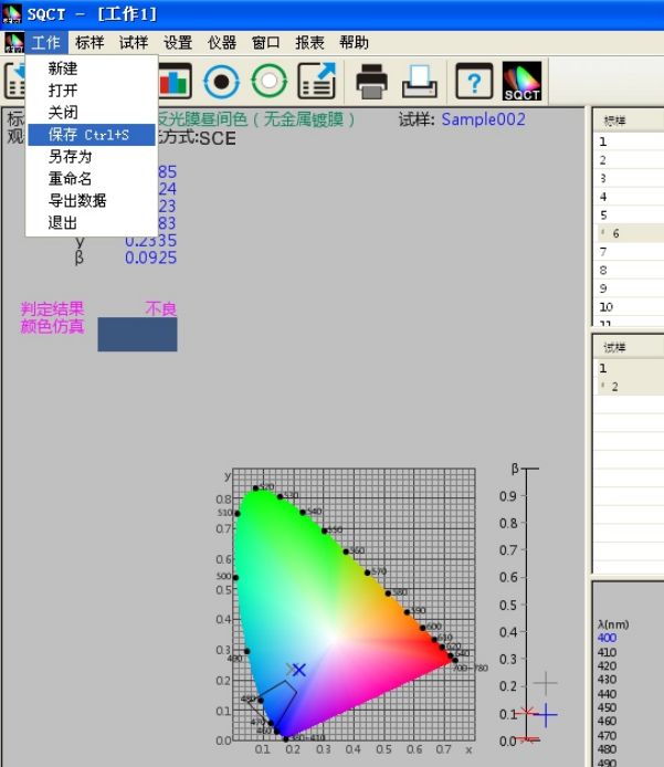 SQCT直接将《GB/T18833-2012道路交通反光膜样》的多边形颜色区域做入软件中,可以直接从菜单中选择,“标样->道路交通反光膜GB/T18833->昼间色(无金属镀膜)”如图11所示。