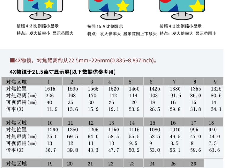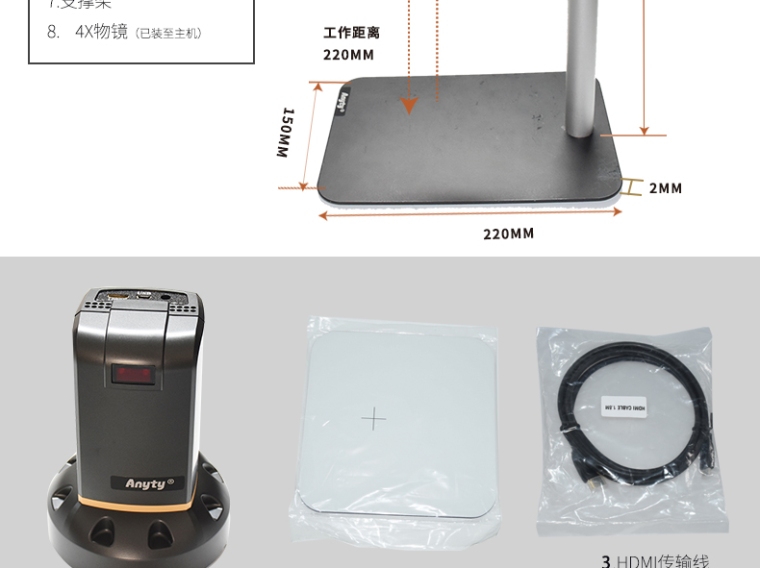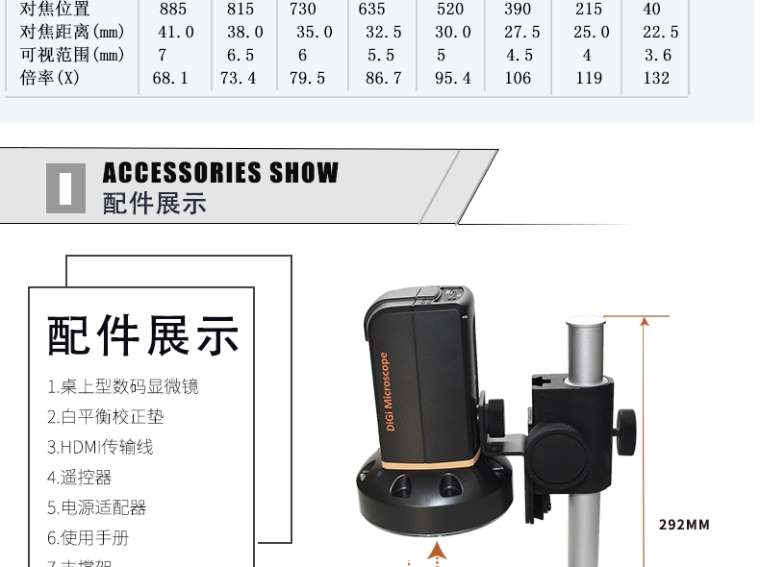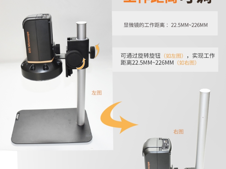 6、工作距离可调。工作距离可以通过旋钮进行调节,可调范围为22.5MM-226MM,适应多样化的工作场景。