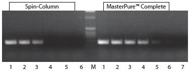 Figure 2. Comparison of PCR sensitivity using templates obtained using the MasterPure™ Complete DNA and RNA Purification Kit versus a spin-column kit. PCR amplification was performed after extraction from serial dilutions of E. coli cells ranging from 2 x 107 (lanes 1) to 200 (lanes 6). Lane M, DNA marker; lane 7, negative control.