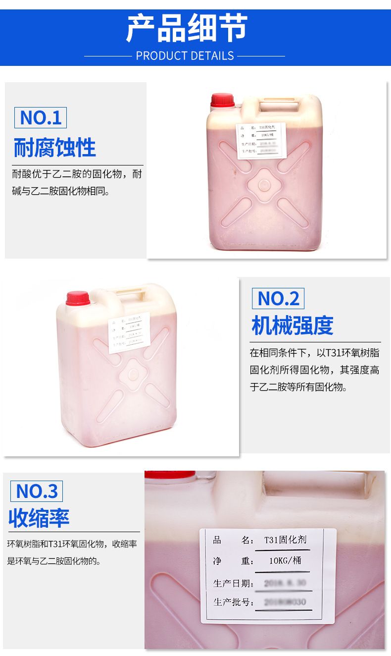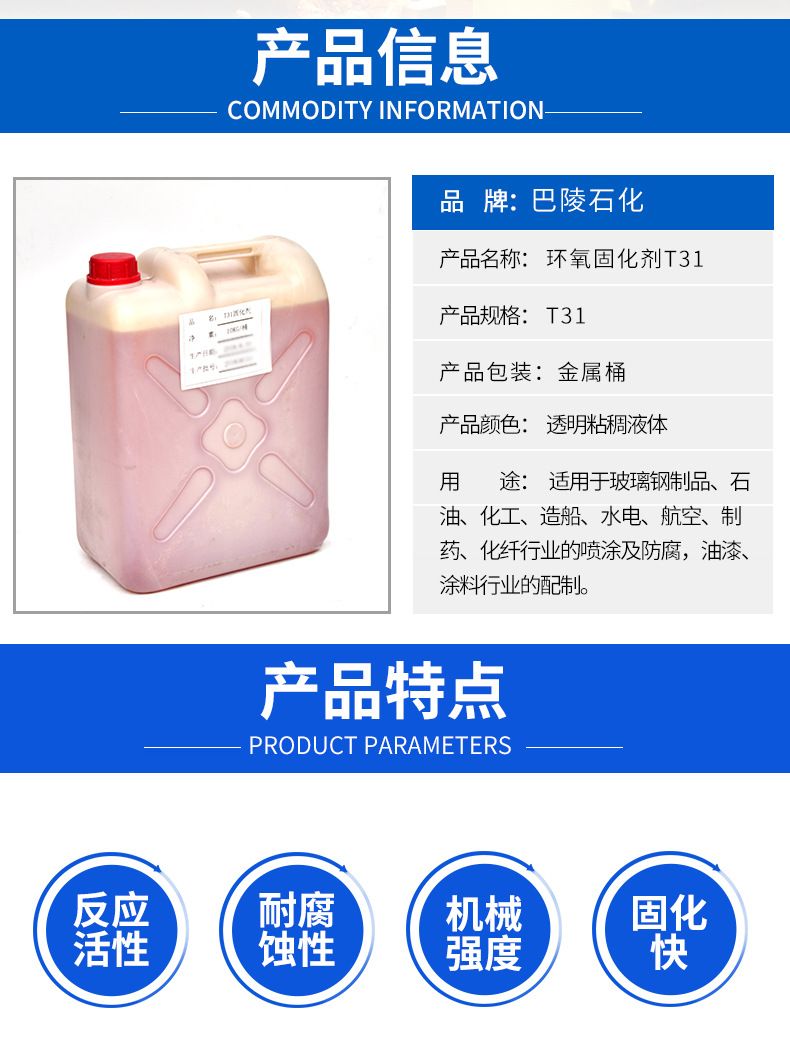 1、T31固化剂与环氧树脂配合,适用于环氧树脂制品、石油、化工、造船、水电、航空、制药、化纤行业的喷涂及防腐,油漆、涂料行业的配制。