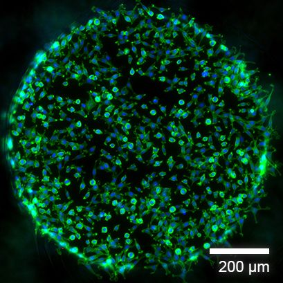 接种后2小时固定在µ-Slide球形灌注液ibiTreat中的L929成纤维细胞的荧光成像。绿色:F-肌动蛋白(phalloidin);蓝色:核(DAPI)。宽视野荧光显微镜,10倍物镜。