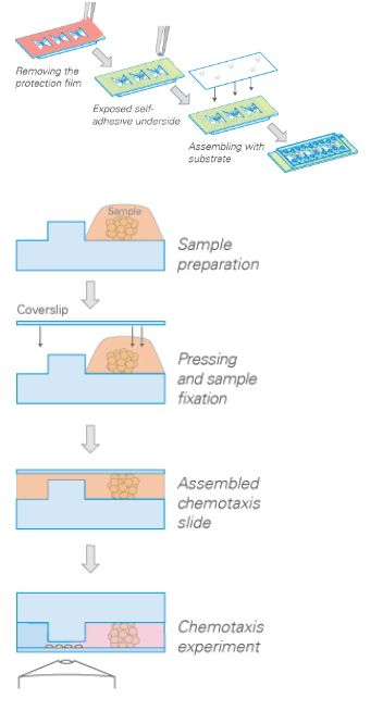 A chemotaxis bottomless slide used in 2D and 3D applications with a self-adhesive underside designed to allow self-assemblage of the slide setup