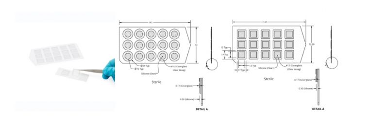 产品由上下两部分构成:上层是No.1.5厚度的玻璃盖玻片,下层是0.5mm厚度的透明硅胶片,无菌包装可直接使用。设计上硅胶片较玻璃片略大,比如盖玻片12*12mm大小,下方的硅胶片17*17mm大小,产品大小特别适于培养皿和培养板使用。包装时,背衬底板是透明大塑料板,一板15个,一包有5板(共计75个)。