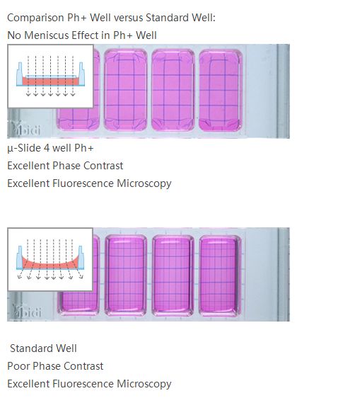 Working with the µ-Slide 4 well Ph+ diminishes the meniscus, so that the whole optical system is aligned, no matter which position of the well is being imaged.