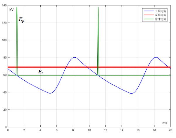 基础源的输出电压一般在60kV~80kV,脉冲源的电压脉冲高达80kV,两者叠加合成后,在瞬间形成一个高达140kV的高压脉冲供给电除尘器电场,其峰值电压远高于电除尘器在使用常规电源供电时的击穿电压。
