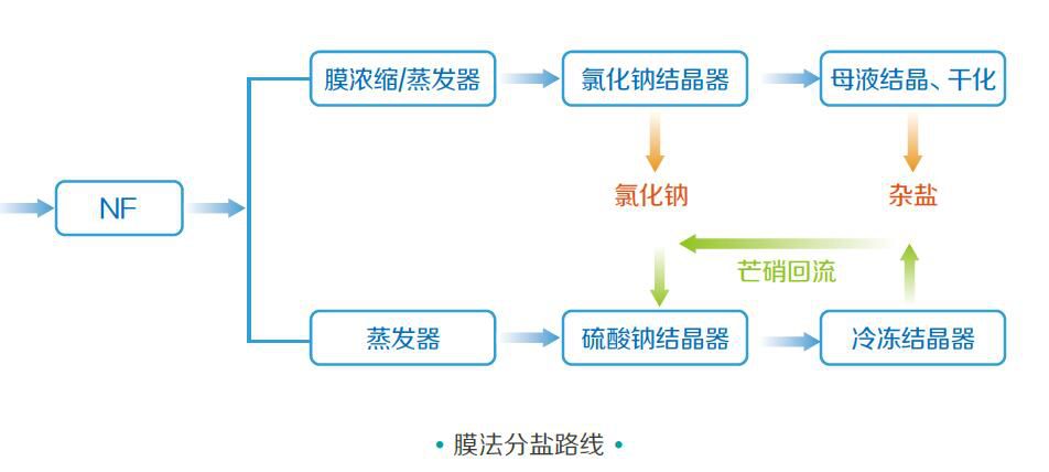 当废水中氯化钠比例占优势时,还可以采用膜法工艺,通过纳滤截留硫酸钠,纳滤产水进一步蒸发浓缩后结晶氯化钠,纳滤浓水蒸发浓缩后,先结晶硫酸钠,再冷冻结晶十水硫酸钠。少量母液采用结晶或干化形成杂盐。