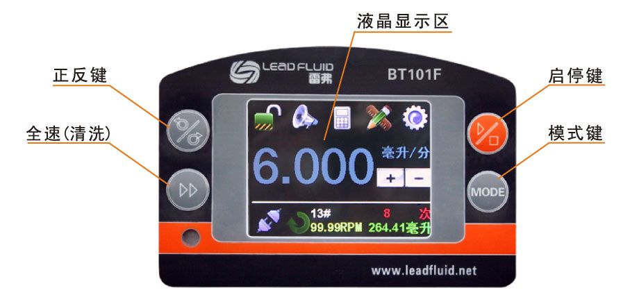 BT101F分配型智能蠕动泵,采用彩色液晶和触摸屏技术,操作界面简单,直观明了。主要适用于各种复杂的液体定量分配、精确计量和定量给料。对液量分装精度要求高时,使用液量分配模式更加方便;对产量要求高时,使用时间分配模式更加方便;需要将一定液体分装为若干份液体时请使用复制分配模式。设置为流量模式时,完全等同于一台流量型蠕动泵。为了减小不必要的风扇噪音,采用了智能温控技术。在RS485通讯中,因为采用了MODBUS协议,更易于与其他控制设备如计算机,人机界面,PLC等连接。