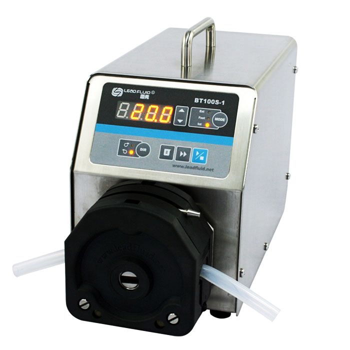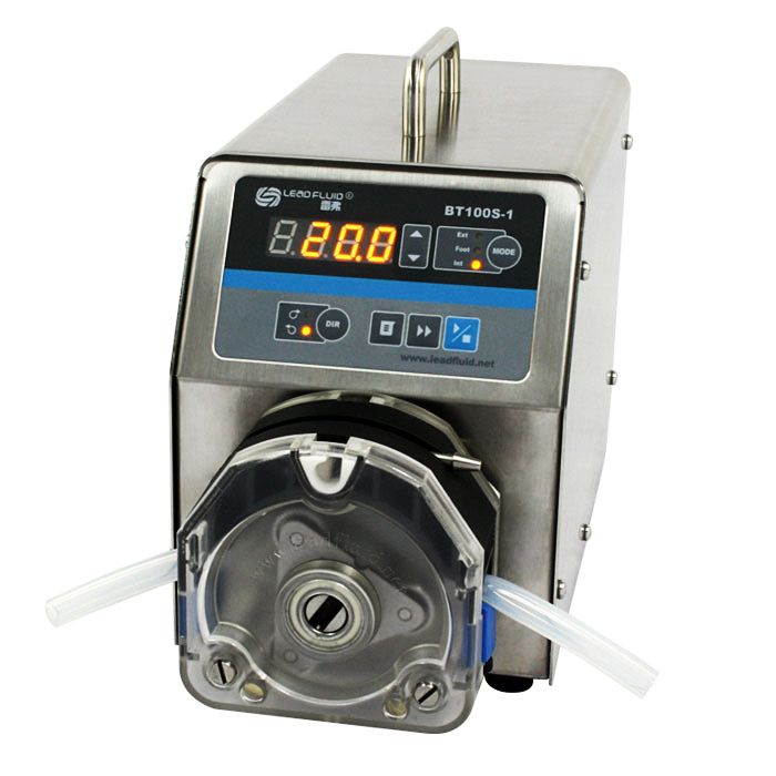 BT100S-1调速型蠕动泵流量范围0.0001~1500毫升/分钟;工作转速0.1-150转/分钟;具有正反,启停,全速(清洗),调速等基本功能外,另外还可通过“简易分装键”实现定时定量输送液体的功能。在RS485通讯中,因为采用了MODBUS协议,更易于与其他控制设备如计算机,人机界面,PLC等连接。