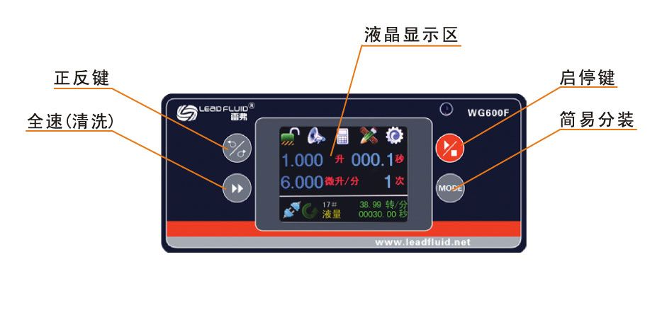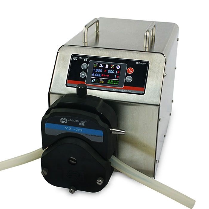 WG600F工业智能型蠕动泵,适于工业场所精准的大流量传输和分装液体。流量范围0.01~13升/分钟;工作转速0.1~600转/分钟;可级联双泵头;无刷伺服电机驱动,免维护,动力更强劲更精准;具有正反、启停、全速(清洗)、流量调节等基本功能。具有液量分配、时间分配和复制分配模式,满足各种复杂的分装要求。RS485通讯接口,采用了MODBUS协议,更易于与其他控制设备如计算机、人机界面、PLC等连接。