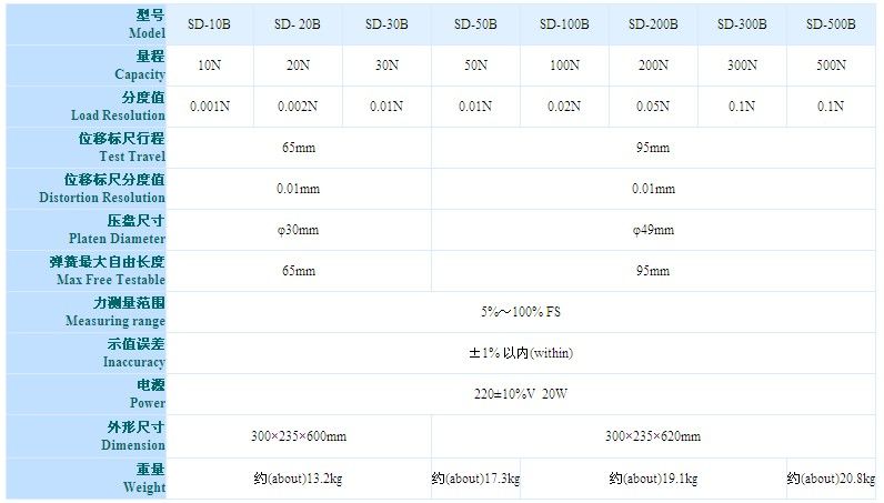 SD-50~500B系列电子数显弹簧拉压试验机是测试拉伸、压缩弹簧的变形量和负荷关系特性的专用仪器。适用于拉伸、压缩弹簧在一定工作长度下的工作负荷的测试,也可用于橡胶、簧片等弹性器件的弹力负荷测试。