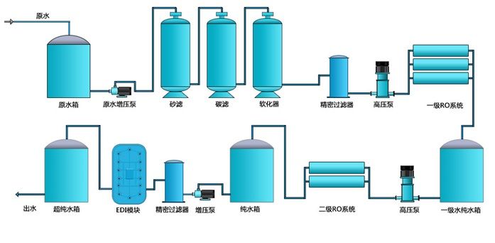 电导率≤0.067us/cm 电阻率≥15 MΩ•cm | 双级反渗透+EDI | SUS316L、SUS304 | SUS316L、SUS304 |