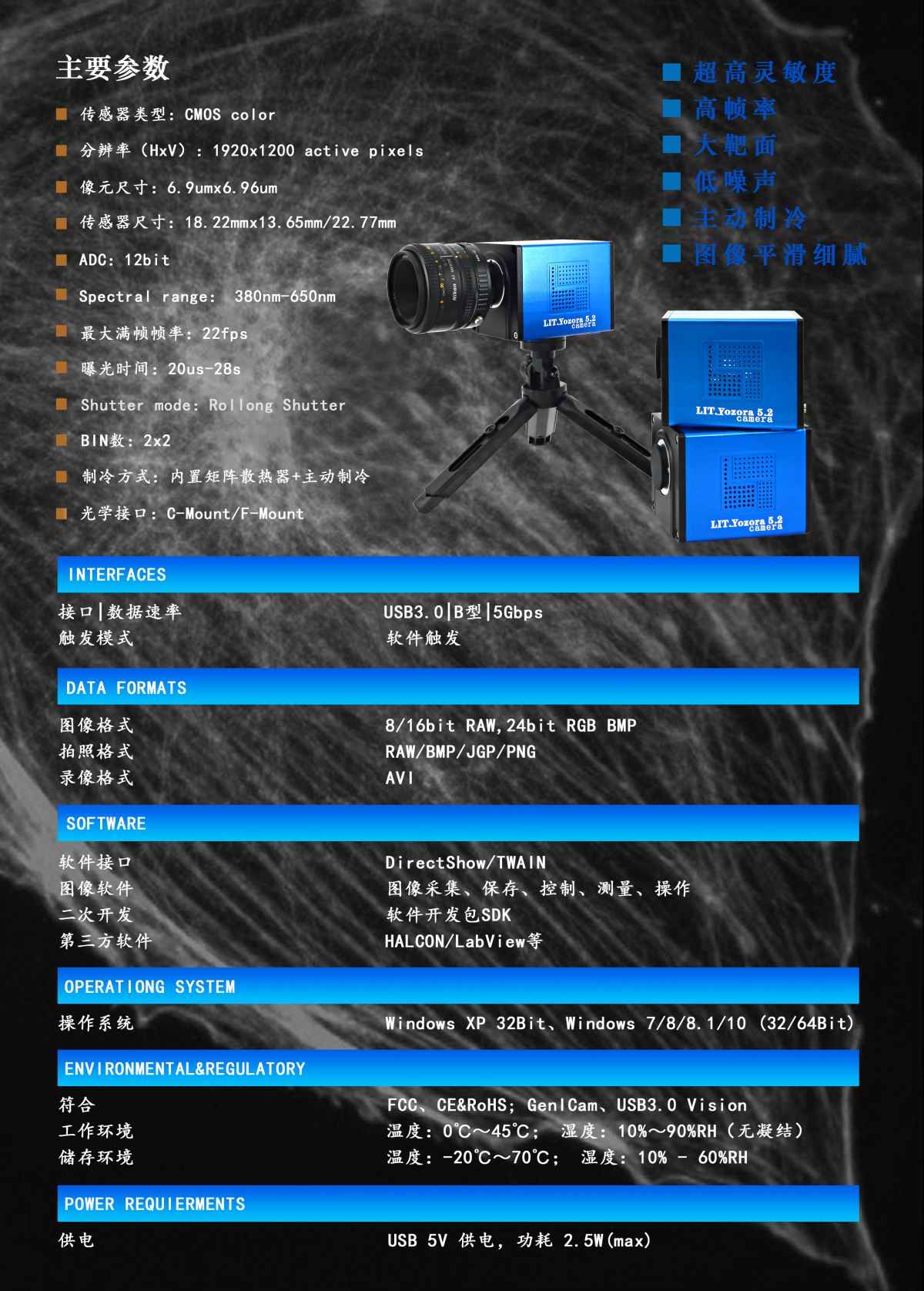 高像素、高速度、高灵敏度、低噪声;
