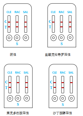 盐酸kelun特罗、莱克多巴胺、沙丁胺醇残留检测应用竞争抑制免疫层析原理。样本溶液滴入检测卡的加样孔后,样本中的待测物与金标抗体结合,阻止金标抗体与纤维素膜上待测物偶联物结合。当样本溶液中的待测物含量大于检测限时检测线不显色,结果为阳性;当样本溶液中待测物含量小于检测限时检测线显紫红色,结果为阴性。