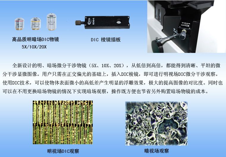 | 物镜 (配备明/暗场微分干涉物镜) | 无限远长距平场消色差物镜(无盖玻片) |