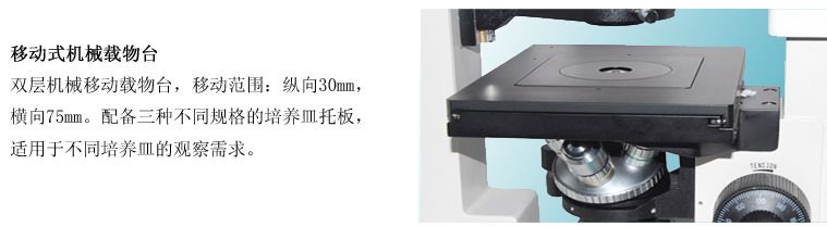 | 载物台 | 双层机械移动载物台,移动范围:纵向30mm,横向75mm。 | |||
