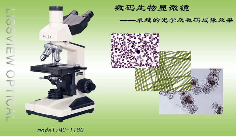 MC-1180数码生物显微镜配置消色差物镜、大视野目镜和数码三目镜,具有成像清晰,视野广阔,操作方便等特点,实现同步 观察与显微图像动态显示,可广泛应用于生物学、医学、工业、农业等领域,是医疗、教学、科研等单位的理想仪器。