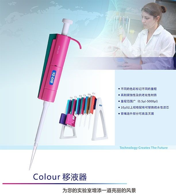 宝予德Colour系列移液器,其下涵盖单道微量可调移液器0.5-1000ul,单道可调大体积移液器1-5ml和多道微量可调移液器5-300ul。Colour彩色移液器产品规格齐全,满足您日常移液需求。