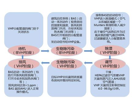 ![]() | 除湿——使隔离器内的空气循环通过除湿装置,将隔离器内的相对湿度降低下来,使VHP灭菌效率提高; 灭菌——输入过氧化氢蒸汽,并保持隔离器内预期的浓度,保持VHP浓度在700PPM以上,并保持灭菌时间30min以上; 除残留——停止输入过氧化氢气体,将灭菌系统切换到除残留系统,使隔离器内的过氧化氢气体循环通过催化器进行分解,降低过氧化氢浓度在10PPM以下,然后通过通风以达到残留值不大于1ppm。 检查工作状态——系统切换至洁净维持状态,按设定的工作风速和舱内的正压,自动变频调节送风量、回风量、新风量,保持舱内洁净度和正压状态,同时在线检测工作区洁净度,也可手动启动浮游菌采样。 |