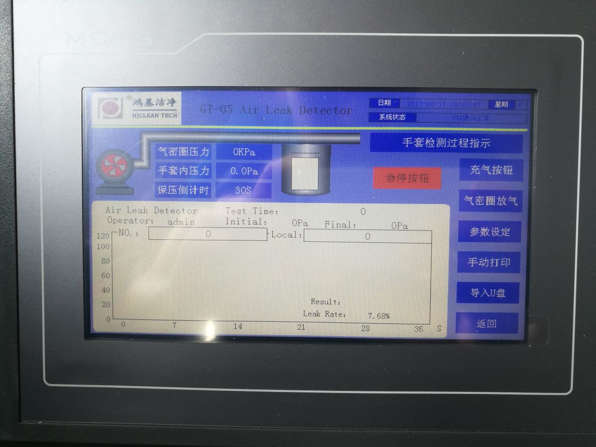 ![]() | 1.将待检的手套的四周密封完好。 2.用气管将GT-05型手套检漏仪的手套检测盘接口与待检手套连接,手提手套检测盘套在待检手套上。 3.接通手套气密检漏仪的电源,根据显示内容,在人机界面上先后填入测试人、检测品的位置、检测品编号等信息。 4.按启动测试按键,开始检测。 5.气密检漏仪自动打印被检测手套的检测曲线,无泄漏的结果为:GOOD,泄漏量大不符合要求的结果为:NG。 |