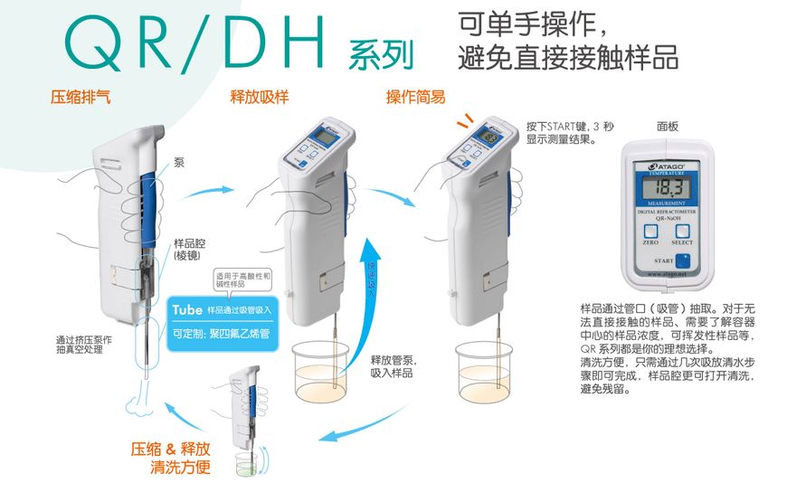 QR-NaHO 吸入式氢氧化钠折射仪可单手操作,避免双手接触样品液,适合危险样品及挥发性样品的测量。