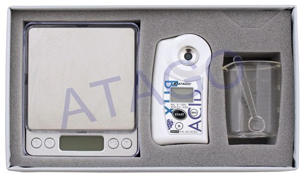 使用ATAGO(爱拓)糖酸度计,糖度可直接取样测量;酸度测量只需添加蒸馏水与测量样品按重量比例(1:50)稀释(即:果汁1ml,蒸馏水50ml)搅拌均匀后即可取样测量。糖度及酸度测量完成后,按R键自动显示糖酸比。