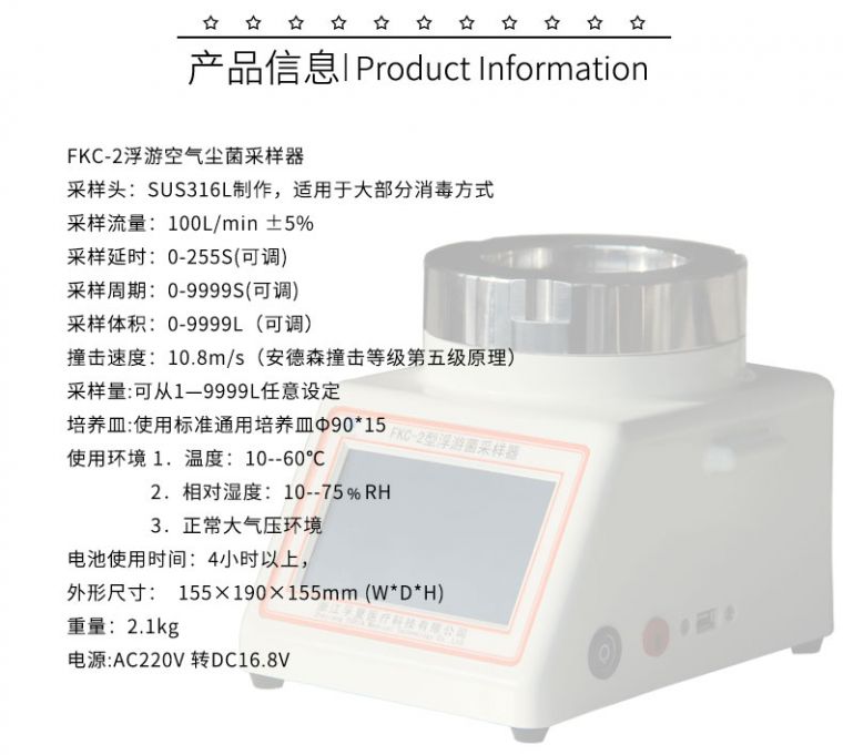 浮游细菌采样器,为国内彩色触摸屏浮游细菌采样器,外壳采用ABS工程塑料一体成型制作,无清洁死角,产品美观大方。本产品严格按照我国新版GMP规范要求,根据安德森撞击原理并参照国外同类产品进行设计制造。它具有下列特点: