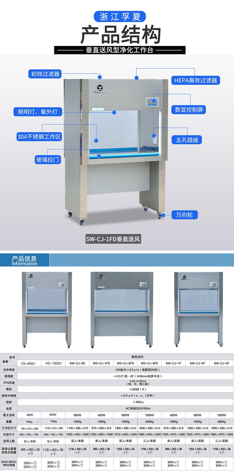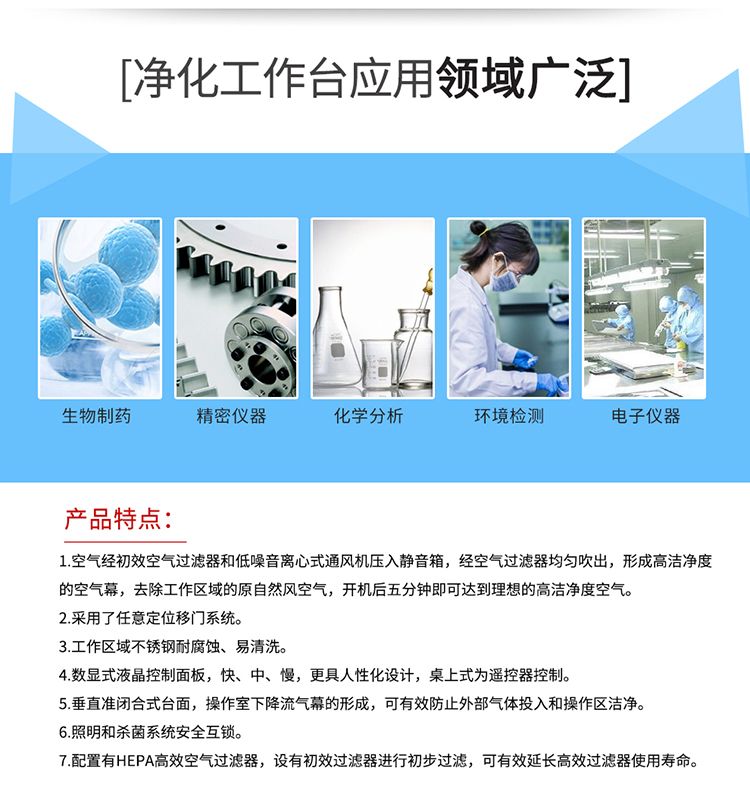 1、采用超薄型无隔板高效过滤器,将静压箱尺寸缩至小,再配以铝塑台面和玻璃侧挡板,使整个工作台显得宽敞明亮。