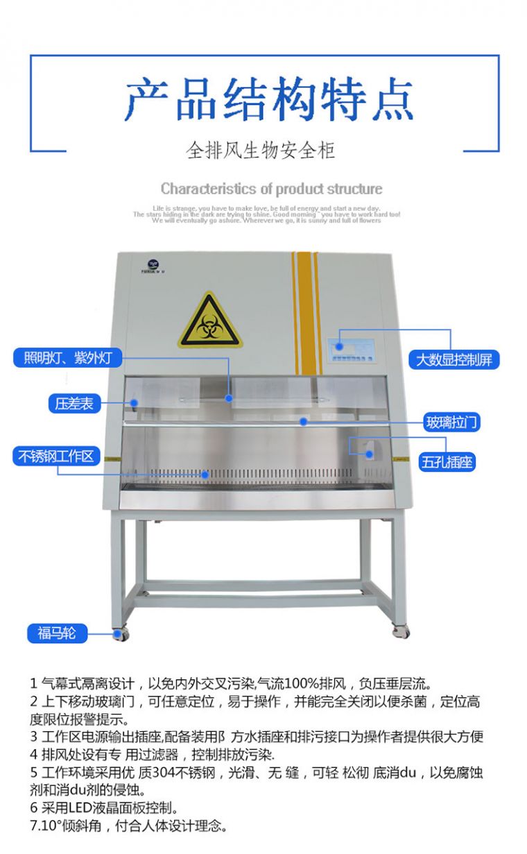 2、上下移动玻璃门,可任意定位,易于操作,并能完全关闭以便杀菌,定位高度限位报警提示。