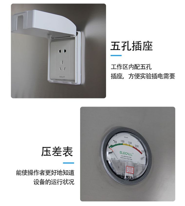 1、气幕式隔离设计,防止内外交叉污染 , 气流外排,负压垂层流。