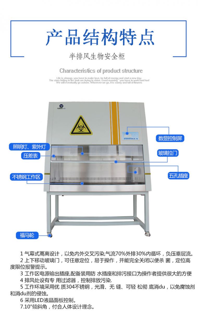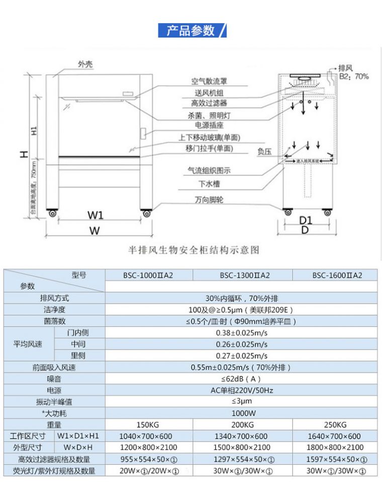 1 、气幕式隔离设计,防止内外交叉污染 , 气流3 0% 外排7 0% 内循环,负压垂层流,无需安装管道。