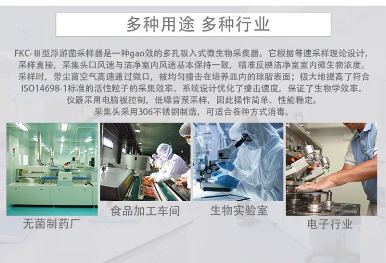 FKC-III型浮游细菌采样器,按照我国新版GMP规范要求,并参照国外同类产品进行设计制造。目前,制药、制品、保健品、饮料、等行业的灭菌车间、实验室、手术室广泛采用菌落法来测定空气中的细菌数。这种方法虽然简便,但存在不少的缺点: